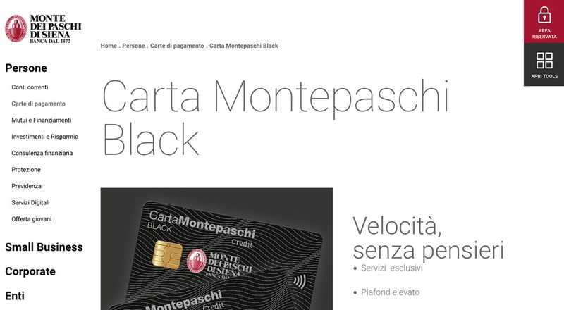 Con Carta Montepaschi Black puoi accedere anche ad altri servizi, tra cui il personal planner dedicato, il pacchetto assistenza e l'assicurazione, che comprendono l'assicurazione per l'assistenza al viaggio, comprese le spese mediche, nonché l'esonero dalla partenza.